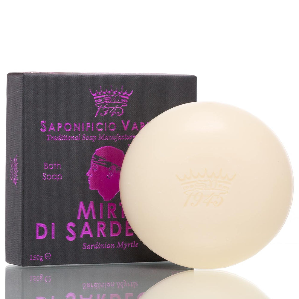 Die Stückseife zur Mirto di Sardegna-Duftlinie. Im selben Duft wie die Rasierseife: mediterran mit Zitrone, Myrte, Lavendel und schwarzem Tee. Pflanzliche Seife nach Marseiller Methode, palmölfrei. 150 g in der Pappbox mit Prägung.